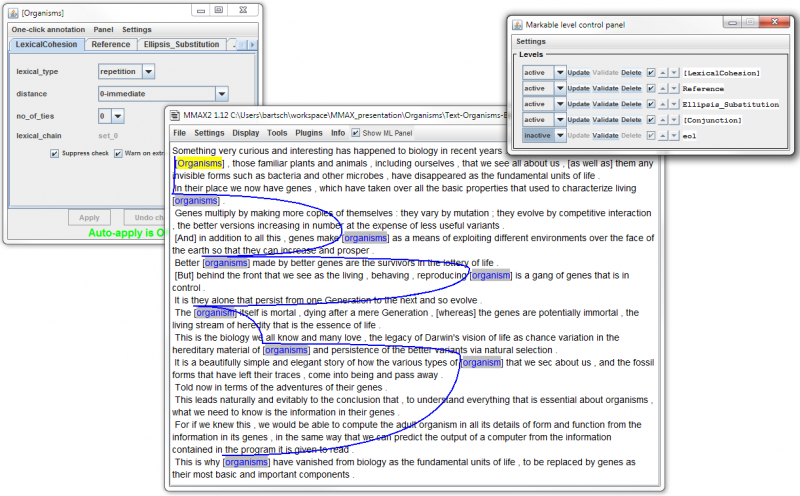 The task that MMAX2 is most suitable for is the annotation of discourse relations especially the annotation of cohesive chains. This is the task that is exemplified by the sample project you just downloaded. When you click on a word that is a constituent of a lexical chain, you see a visualization of the chain between all elements the word is related to. The following screen shot shows the three MMAX2 windows that are open whenever you are annotating text.