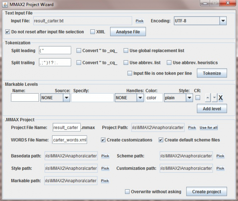 • Give your project a name and choose your project path. It is useful to create a folder for each text you want to work with in MMAX2 because MMAX2 will create some files referring to your text.