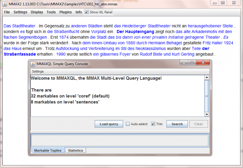 MMAX2 ships with its own annotation query language called MMAXQL. MMAXQL allows you to perform queries on annotated MMAX2 documents in the query console, for detecting, browsing and quantifying markables with certain features. You can find the query console in the toolbar under _Tools_.