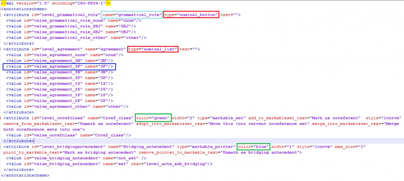 As you can see, inside the annotation scheme you have the attributes. They always need an id, a name (as highlighted in light blue), a type (highlighted in red) and they may contain some information in text. As type attribute you can assign nominal_button or nominal_list. The attributes get values which also need an id and which get a name. The name you give your value will appear in the MMAX2 annotation window next to your button or in the drop down list. You can add as many values as your annotation task requires.
