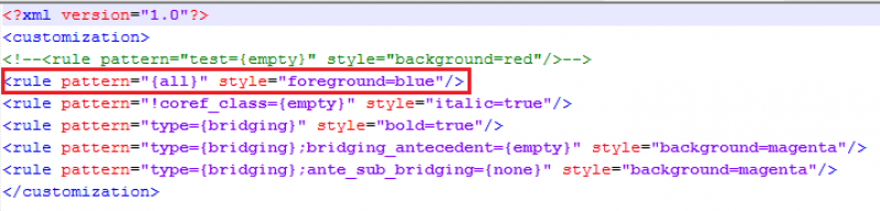A customization schema defines what your markables and your text will look like. The default value for your text is black, so everything that has no markable will be black. The value _pattern_ indicates which part of your annotations will be concerned by the value _style_ you can change. The value _foreground=blue_ indicates that every pattern chosen will be marked in blue. But you can also set your markables to italic or bold.